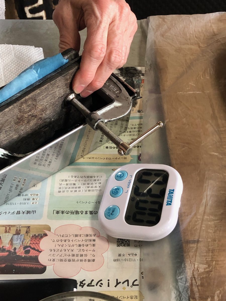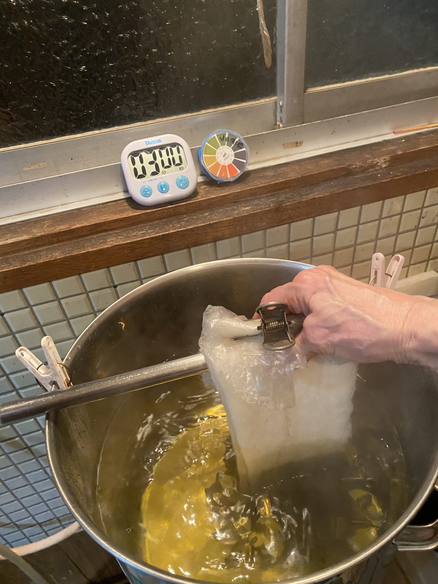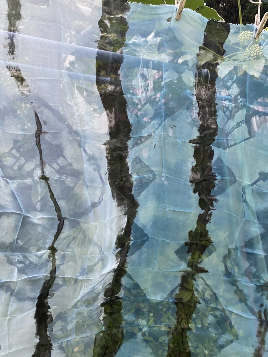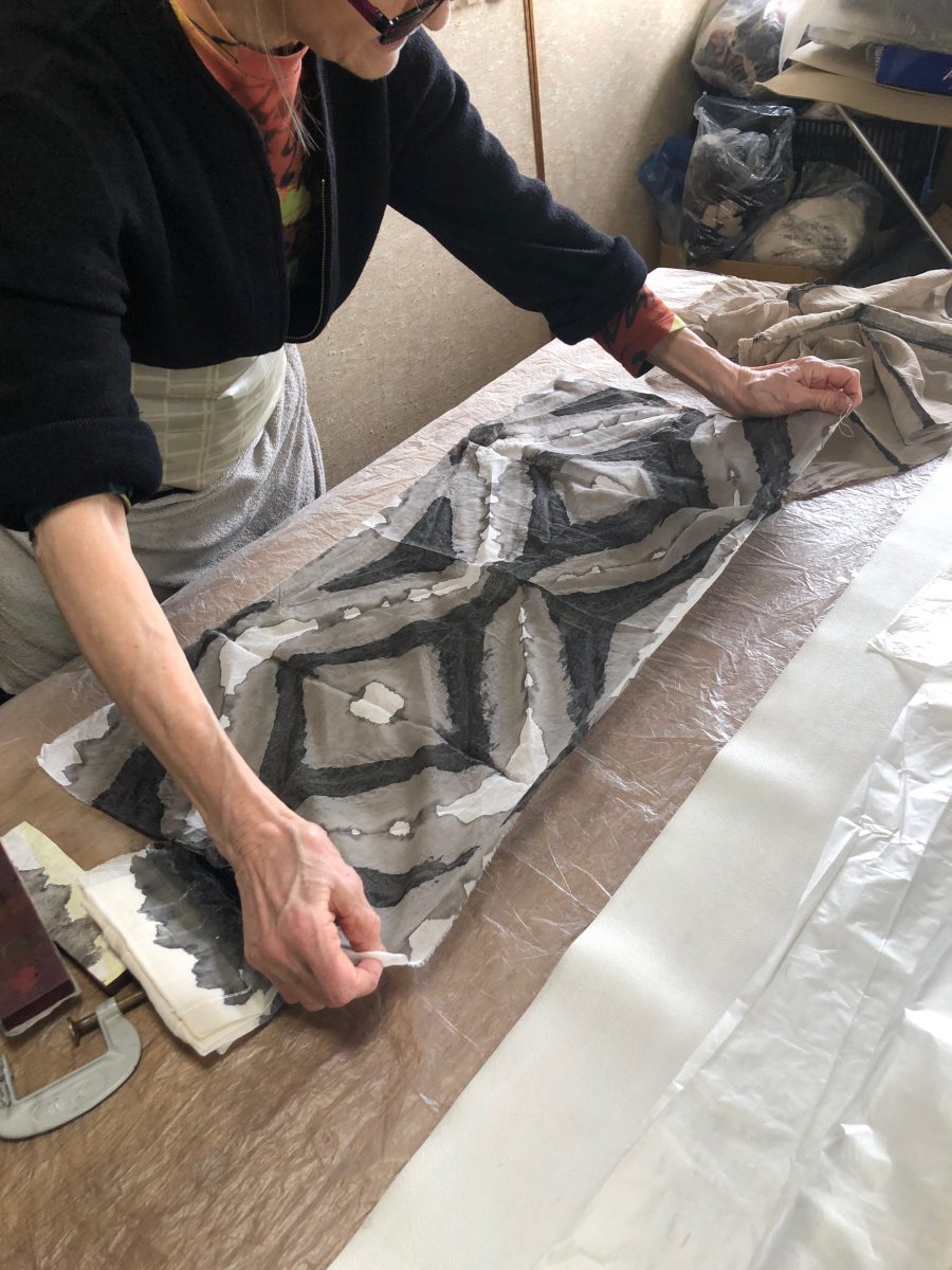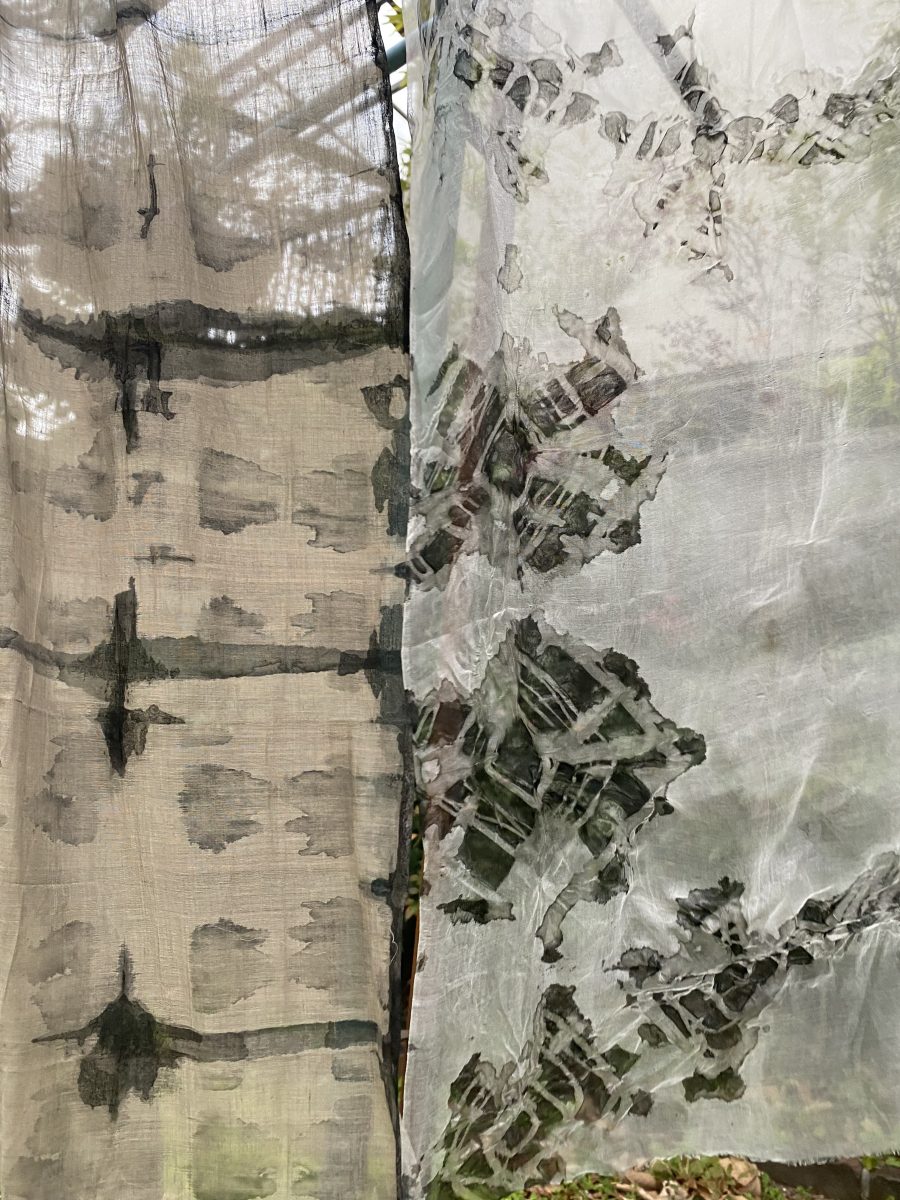Students will practice making repetitive motif patterns on silk with shibori resist and silk sericin protein removal solution, resulting in two qualities of fabric in one: organza and Pongée. You will also work with carbon sumi ink, applying it directly onto the silks and also to natural vegetable fiber fabrics (cotton gauze, linen, rayon, ramie).