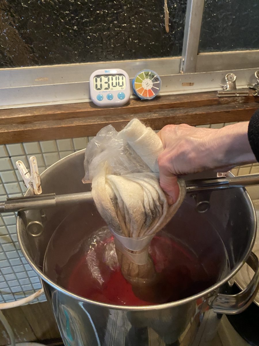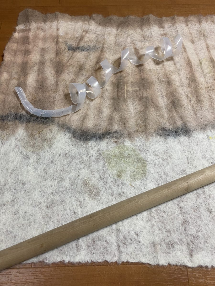 After preparing a white, translucent, Valais Blacknose wool felt sample, students will execute a tinted pattern through Shibori clamp-resist, wrapping, and use of acid dyes.