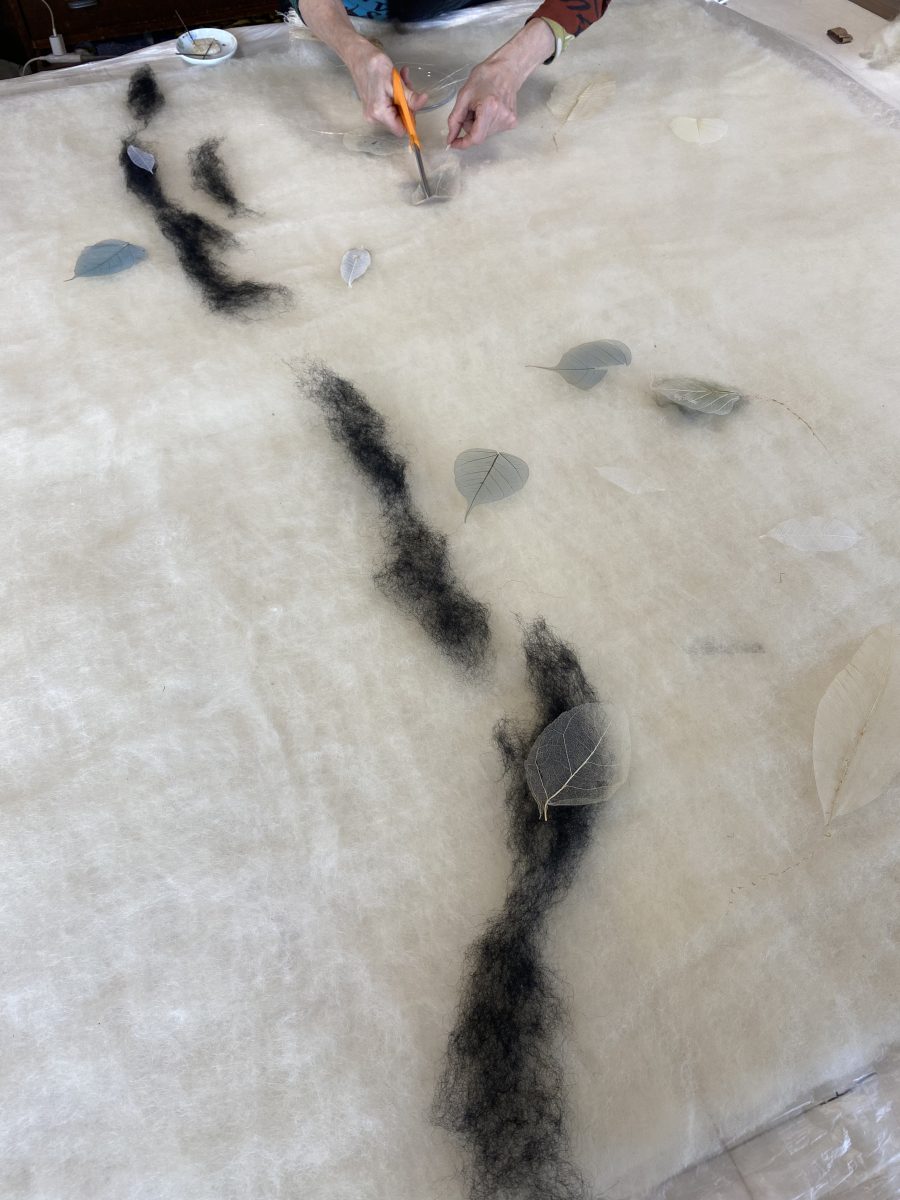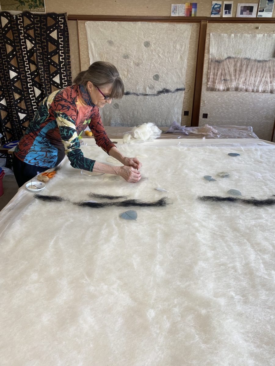 Jorie will display a new series of wall/window treatments produced with translucent Swiss wool, skeletal leaves, Kudzu fiber, paper thread, and clamp-resist Shibori dye technique.
